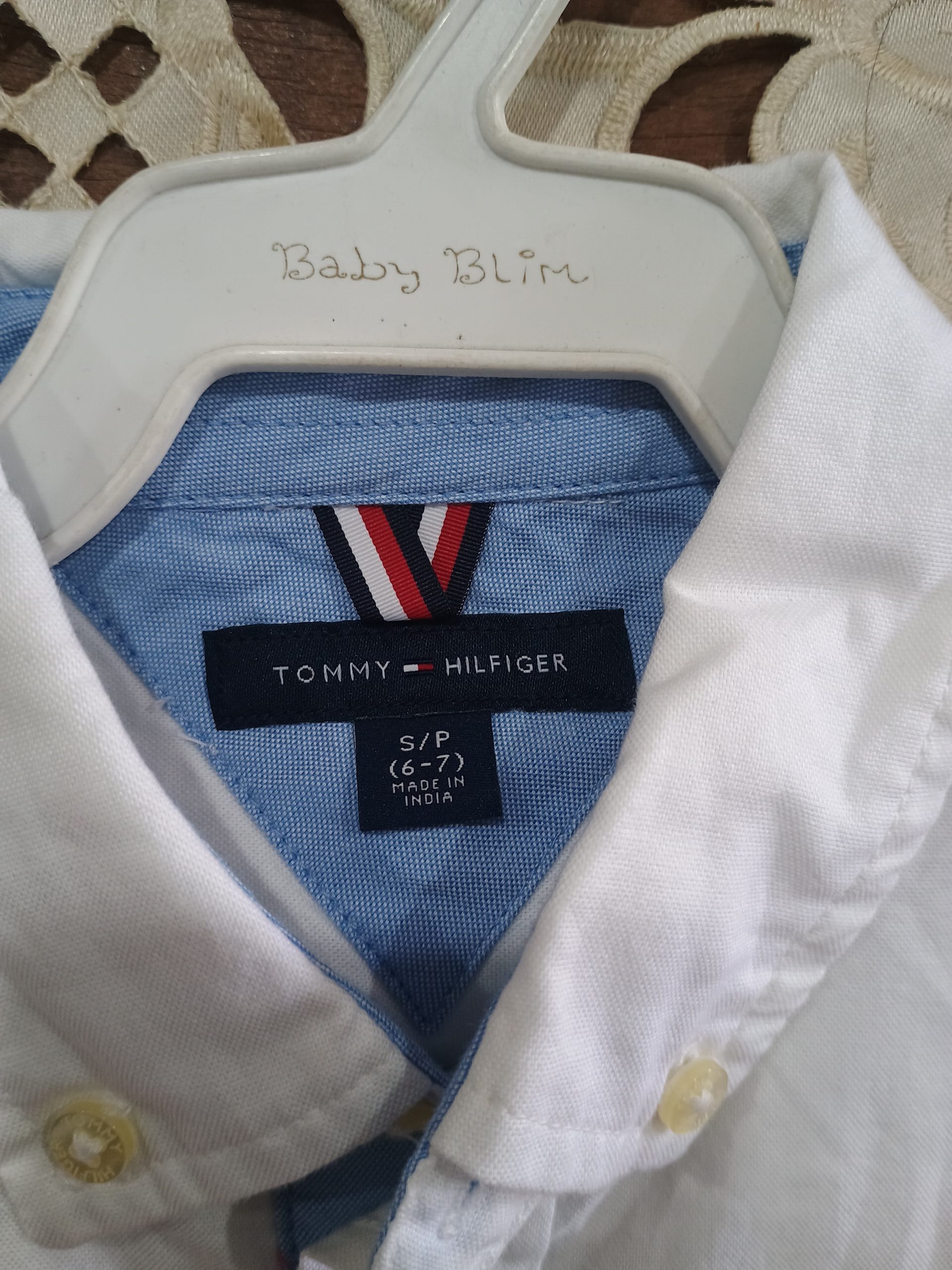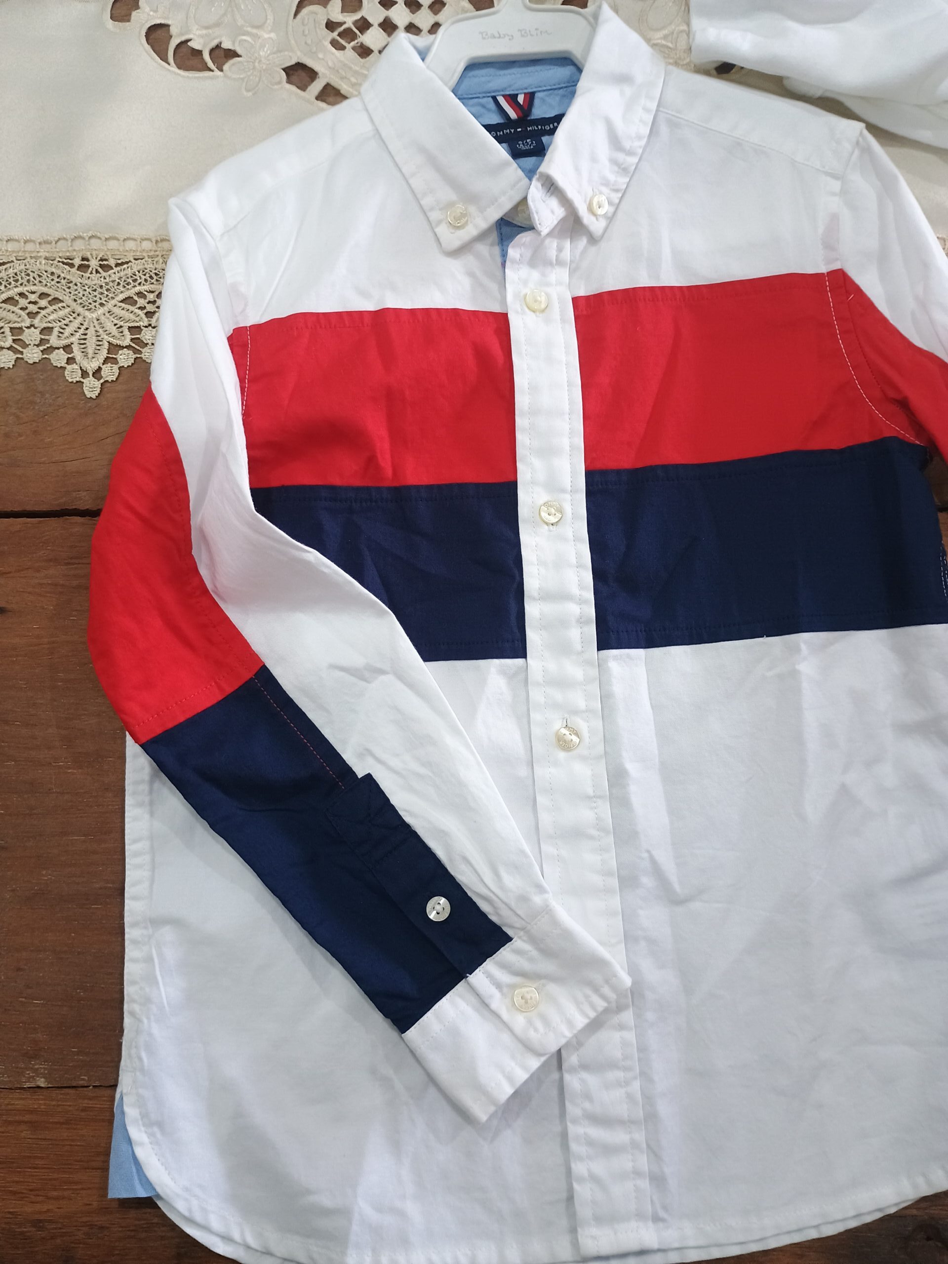 Camisa infantil Tommy Hilfiger Original, com o clássico design tricolor da marca.