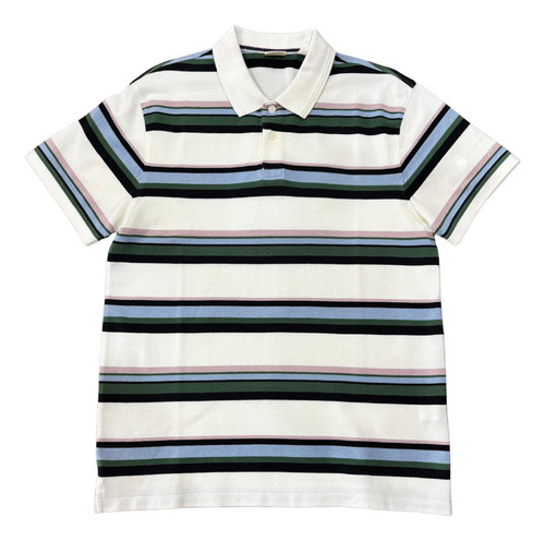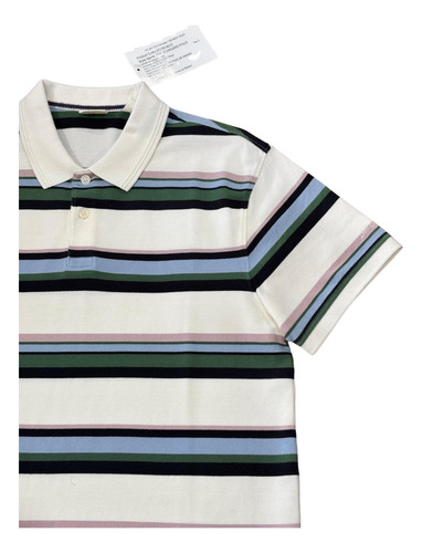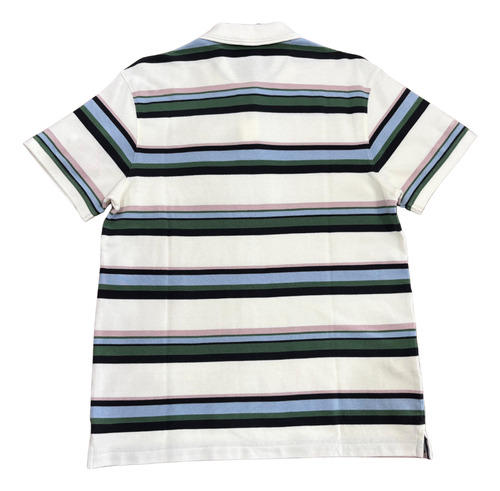 Descubra o estilo contemporâneo e descontraído desta Camisa Polo Levis. Com uma base branca nítida, a peça é realçada por um padrão de listras moderno em cores que se complementam: verde militar (ou verde escuro), preto, azul claro e um toque suave de rosa antigo (ou lilás pálido). Esta combinação única traz um ar “retro chic” e é perfeita para quem gosta de se destacar com elegância e conforto.