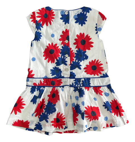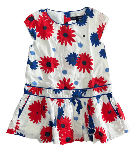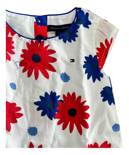Vestido infantil Tommy Hilfiger Original, com estampa floral vibrante em vermelho e azul sobre fundo branco.